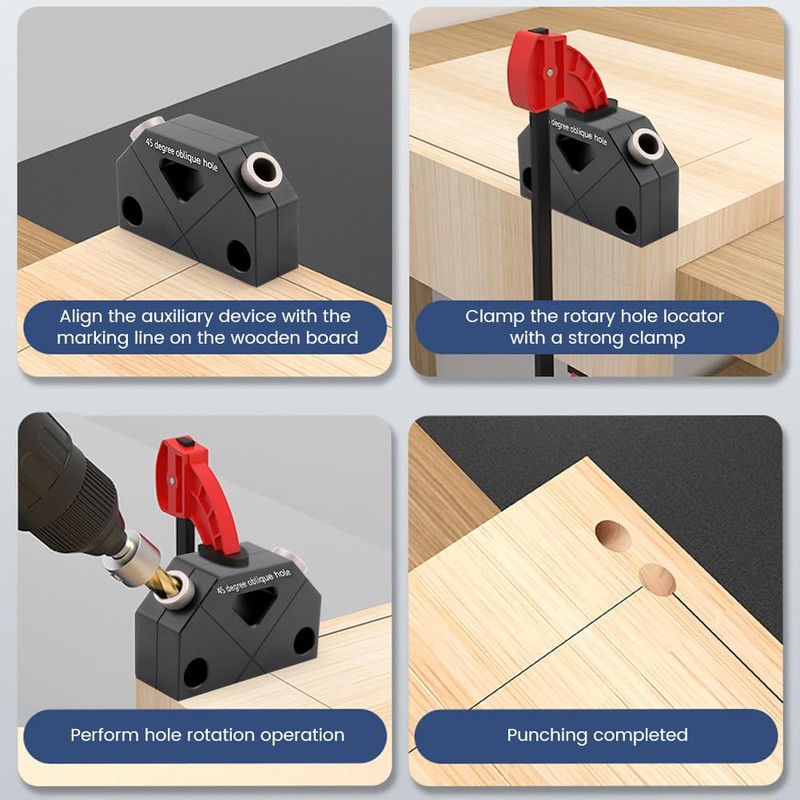 【EASY USE】Align the auxiliary device with the marked line on the wooden board, clamp it with a strong clamp, and use the hole positioner to perform the hole turning operation, and the hole is completed.
