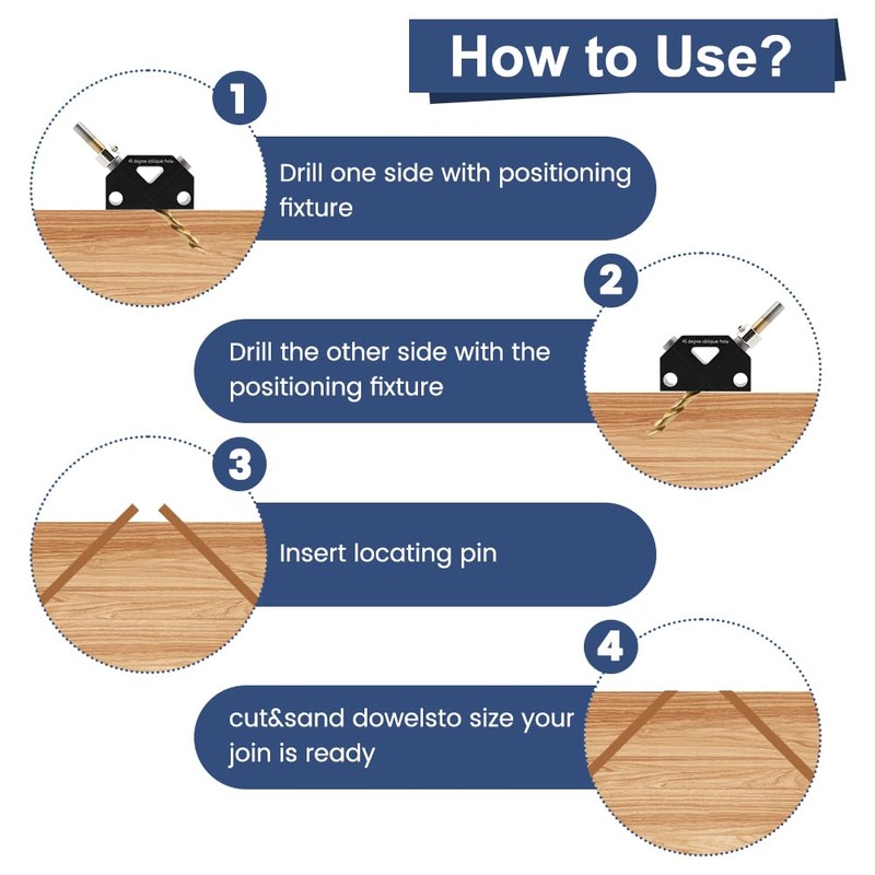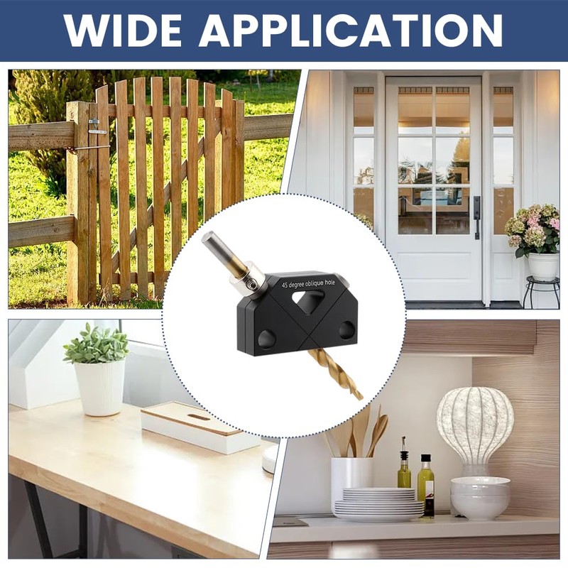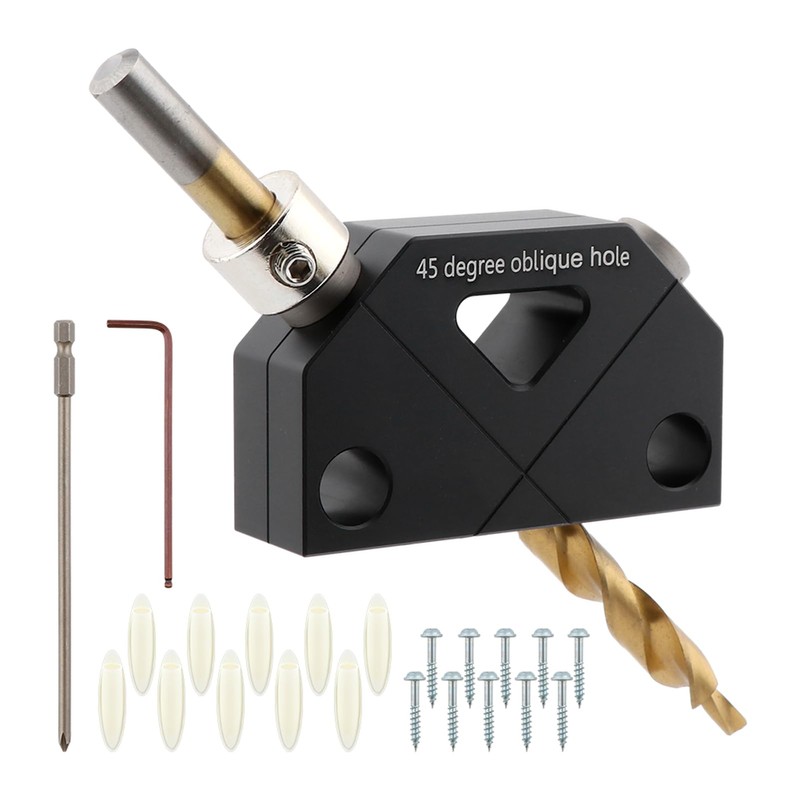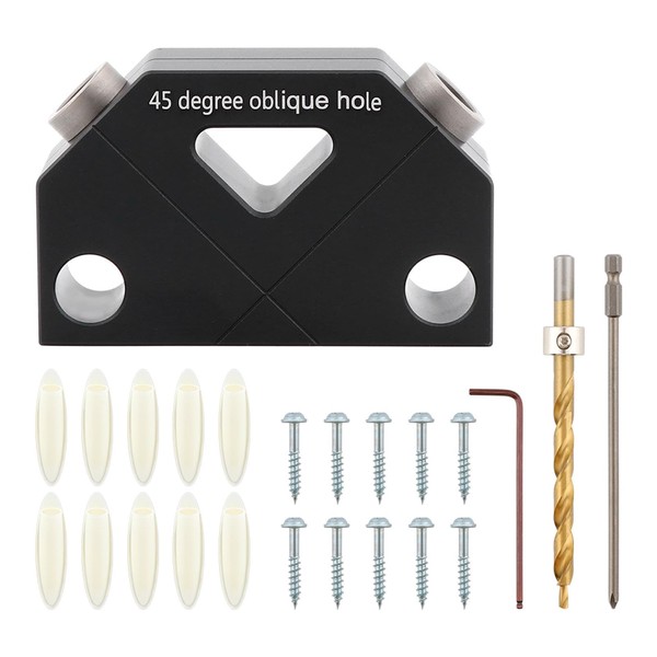 - 【WHAT YOU WILL GET】You will receive 1pc 45 degree dowel jig, 10pcs screw, 10pcs plug, 1pc 9.5 drill bit, 1pc bit, 1pc wrench, holding work securely without damage to the wood, realize simple and convenient precise drilling.