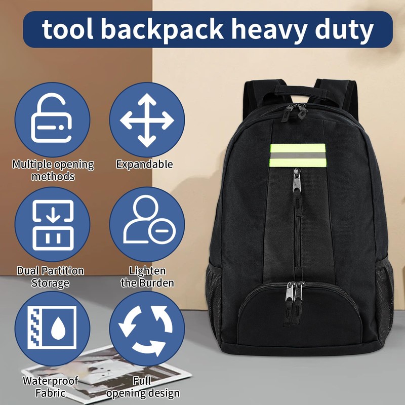 - HEAVY DUTY TOOL BACKPACK - backpack tool bag Made with 1680D Oxford fabric, this tool bag backpack is puncture-resistant, and wear-resistant to ensure long-lasting use. You can also sort tools according to different product, so that the tools carried are more clear. Backpack with 2 front zipper pockets and 2 side pockets can be stored according to your different tool needs.
