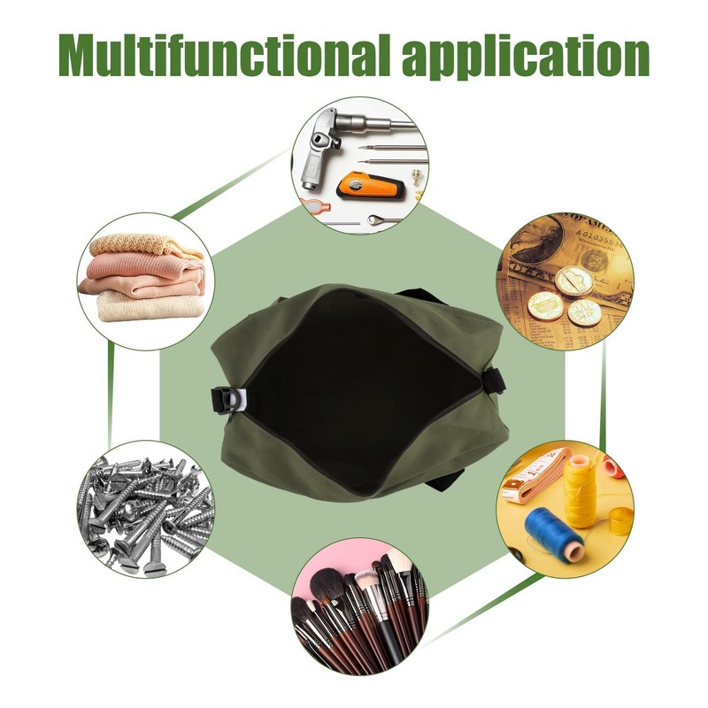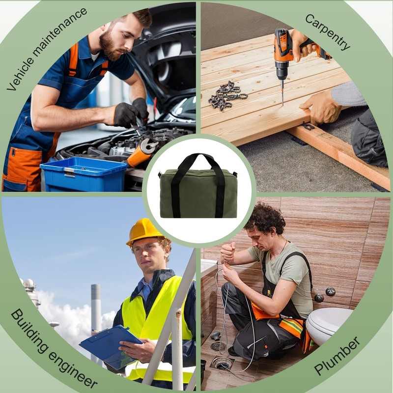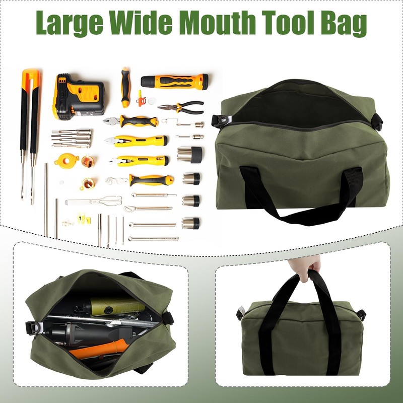 - 【Wide Application Tool Bag】This wide mouth canvas tool bag is very convenient for storing hammers, pliers, wrenches, screwdrivers, nuts, nails, tapes, other tools and spare parts. Suitable for vehicle maintenance, woodworking, construction, technicians, maintenance personnel, plumbers, gardens, carpenters, hobbyists, etc., can also be used as cable bag, travel accessory bag, mechanic bag, artist bag, brush bag, makeup bag, electronics bag, construction bag, zipper tool bag, etc.