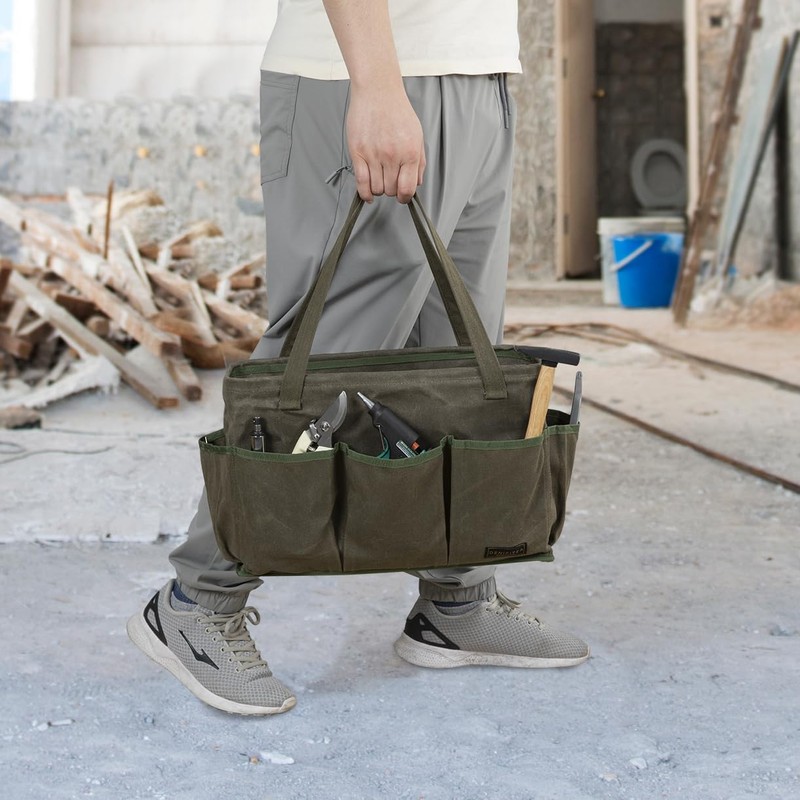 Tool Bag with Metal Frame, Waxed Canvas Wide Open Top Tool Tote Bag with 9 External Pockets, 15.5 x 7.5 x 10.5 Inches (ArmyGreen)