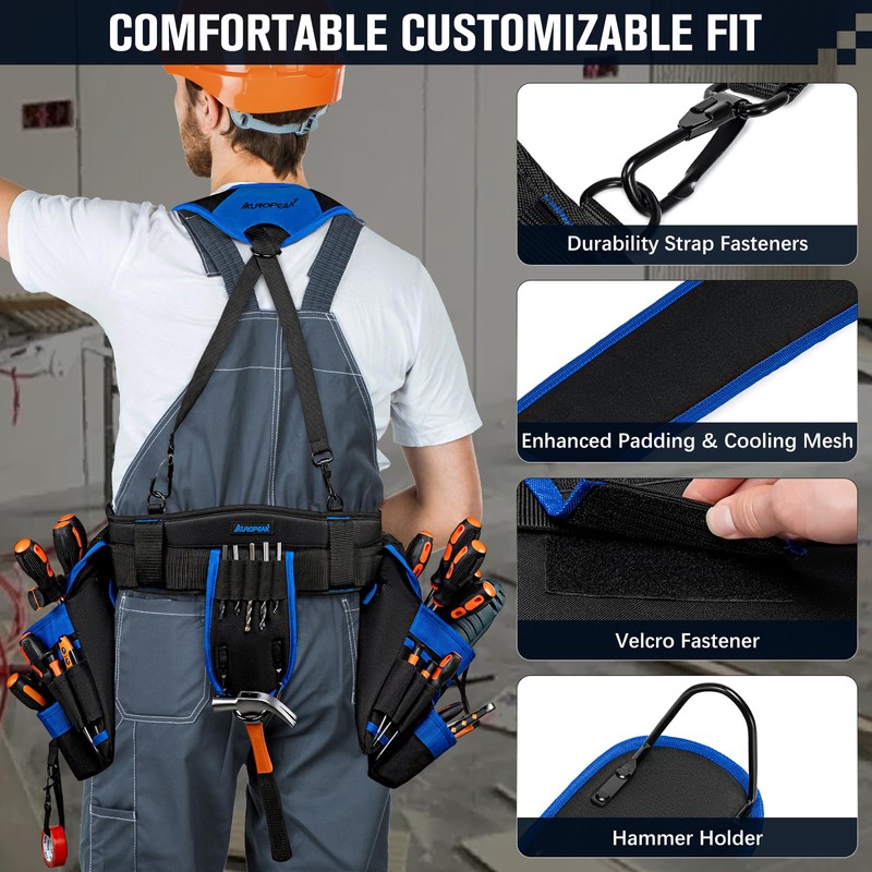 - FULLY CUSTOMIZABLE & REMOVABLE DESIGN – Our professional tool belt features a size-adjustable waist (33''-48'') and detachable 4-point suspenders for even weight distribution, reducing strain. Two tool pouches and a hammer holder can be repositioned or removed entirely to match your tool load and job demands—optimize comfort and organization effortlessly