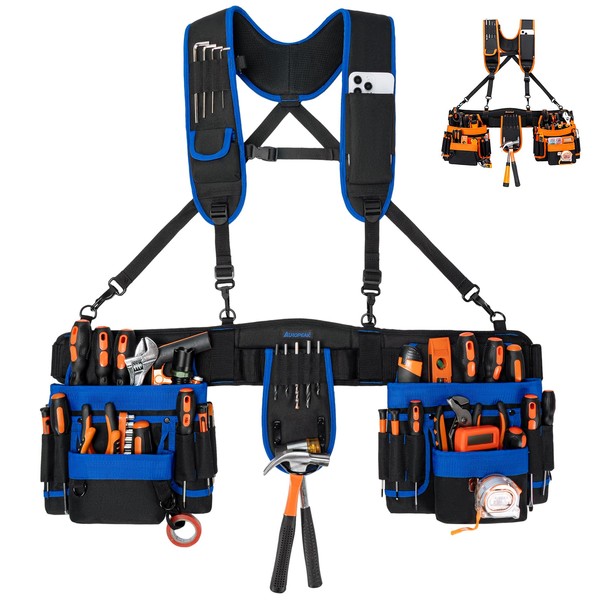 Tool Belt Suspenders, 33-Pocket Electrician Tool Belt, Tool Belts for Men with Detachable & Adjustable Tool Pouches Bag for Framers, Carpenter, Roofing, Contractor(33''-48'') Blue