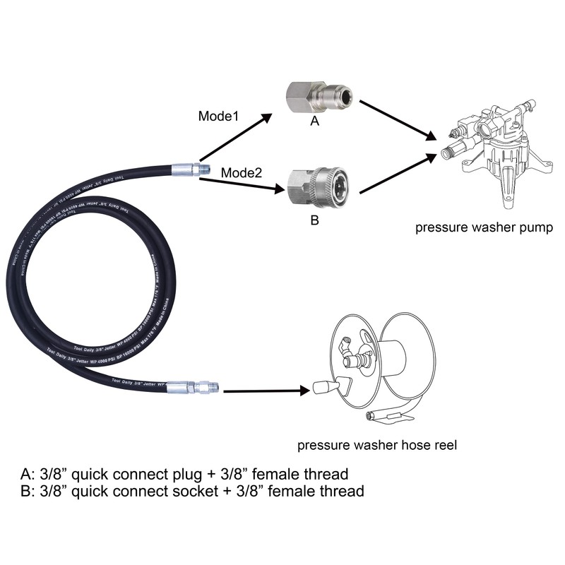 - Package include: 1 piece pressure washer jumper hose ( 8 FT ), 1 piece 3/8” quick connect plug + 3/8”female thread adapter; 1piece 3/8” quick connect socket + 3/8” female thread adapter.
