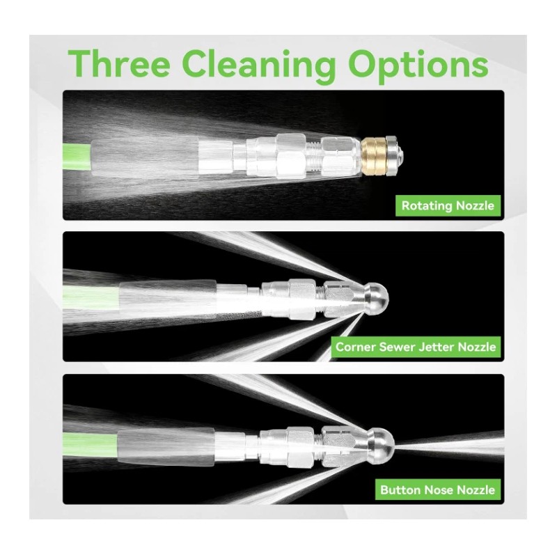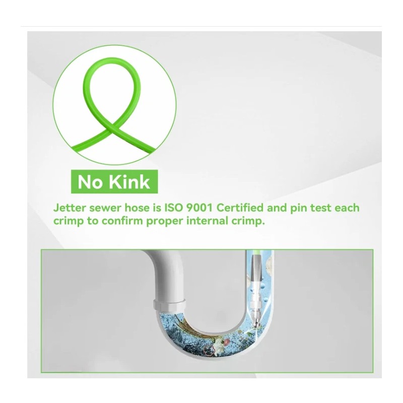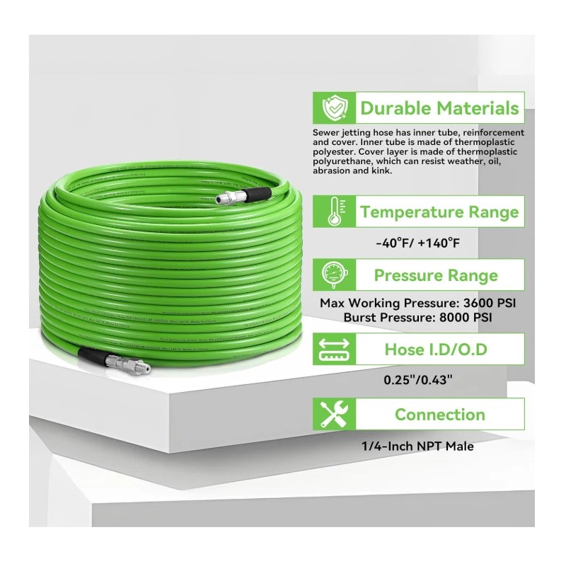 - UPGRADED JETTING HOSE: The water jetting hose has a 0.44in outer diameter. It's flexible yet tough, with a fixed and a swivel fitting. This design lets the hose and nozzles pass through the sewer line easily and prevents kinking. Made with a PE tube, PVC cover, high-intensitive terylene reinforcement, reinforced protective sleeves, and heavy-duty ends, it's extremely sturdy and durable. It can resist weather, oil, ozone, and abrasion. Max pressure: 3600PSI. Working temperature: -40℉ to +140℉