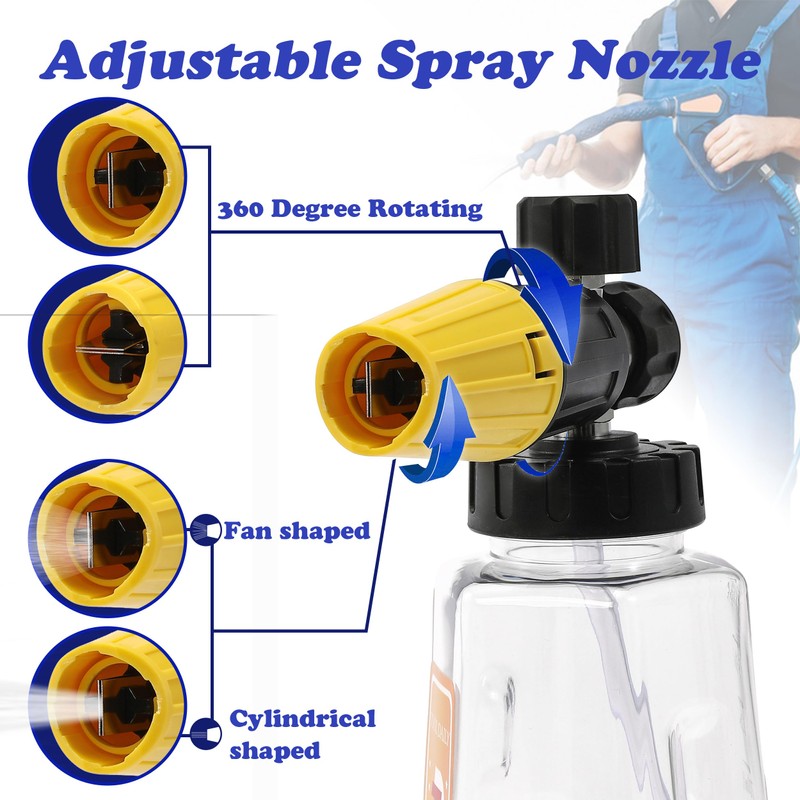 • UPGRADED FEATURES: Our foam cannons' working pressure is 1000 psi to 3600 psi. The container bottle features a larger mouth for easy filling and an extra-wide neck to prevent cracking and leaking. The foam sprayer comes with a 1/4 fitting and has a container capacity of 1 Liters. With a large capacity foam cannon, you can clean for longer periods of time and tackle larger cleaning jobs.