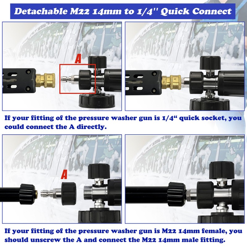 • QUALITY MATERIAL: Constructed from premium-grade materials, our power washer foam cannon connector promises exceptional durability and reliability for prolonged use. It's designed to be compatible with most pressure washers and foam sprayer in the market, making it a universally useful tool for a wide array of cleaning applications.