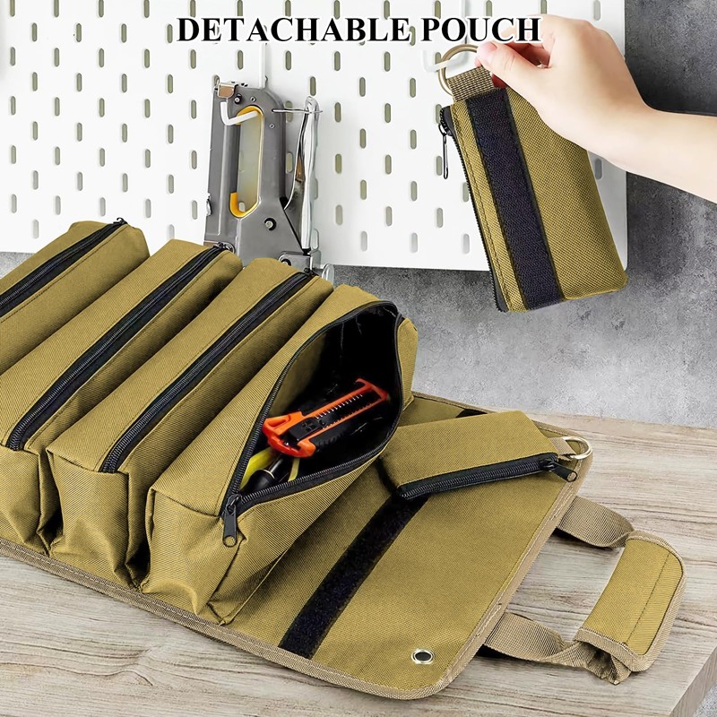 Tool Roll Up Bag, Tool Organizer Bag Tool Roll Up Bag, Heavy Duty Tool Organizer With Detachable Pouche, Portable Tools Box Storage, Detachable Tool Roll Bag for Electrician Mechanic Carpenter (Khaki)