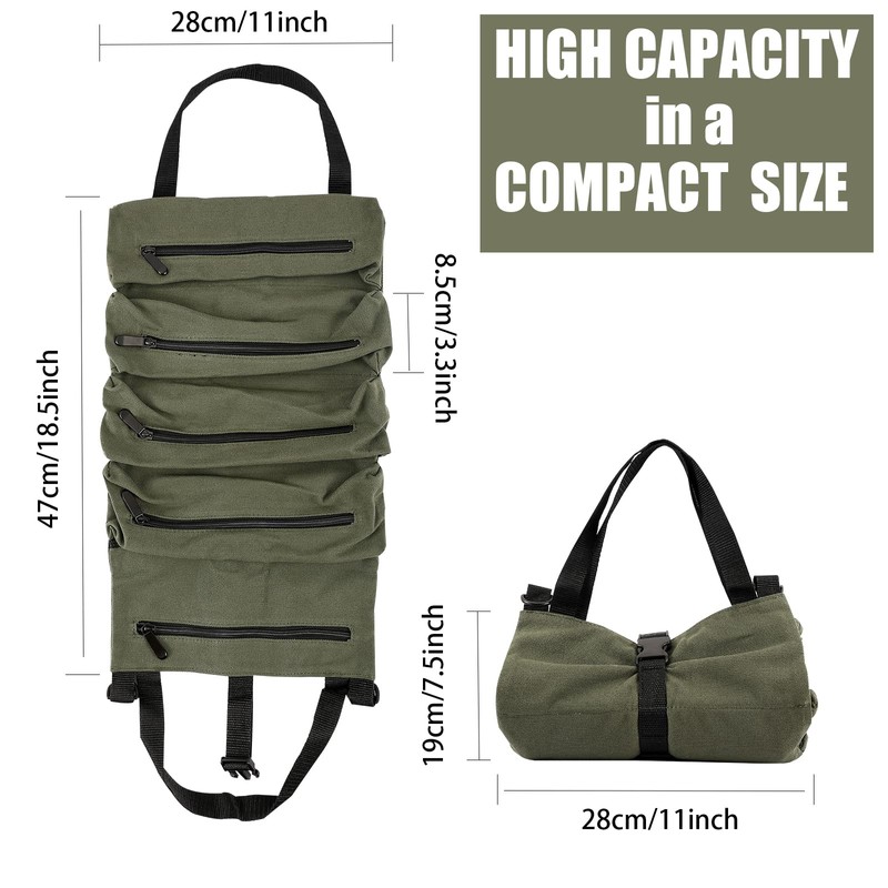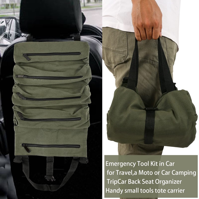 Tool roll up Bag, Wrench Organizer and Tool Pouch, Roll Up Tool Bag, Store Tool Organizer Bucket, Hanging Tool Zipper Carrier Tote, Car Camping Gear Tool Storage for Mechanics (Green)