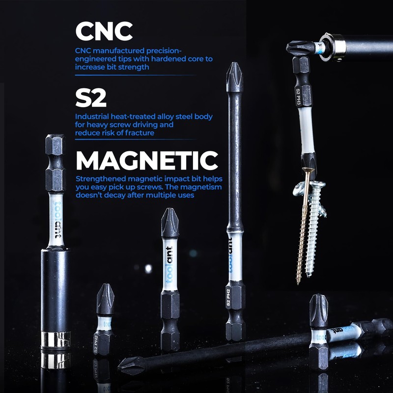 - 【Durable Materials】toolant adopts high-quality S2 alloy steel material with our special heat-treatment technology ,which offers exceptional wear resistance, impact resistance, and hardness,enhancing the strength of bits.Manganese Phosphate surface to prevent rust.