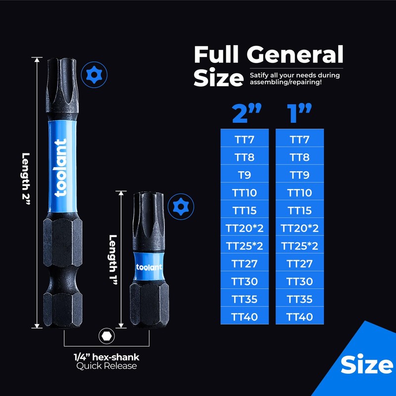 - 2” tamper proof torx bits 13pcs (tt7, tt8, tt9, tt10, tt15, tt20*2, tt25*2, tt27, tt30, tt35, tt40), 1” tamper proof torx bits 13pcs (tt7, tt8, tt9, tt10, tt15, tt20*2, tt25*2, tt27, tt30, tt35, tt40), 3” magnetic impact bit holder for tight space screw driving.