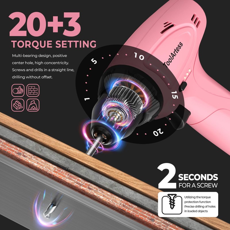 • Dual Speed and 20+3 Torque Settings: The adjustable speed makes this drill easy to work with, through low speeds of 0-700 RPM and high speeds of 0-1500 RPM, as well as 20+3 torque adjustment to accommodate different surface hardness. Both rough and firm surfaces can be adapted to achieve precise and perfect results