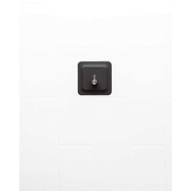 The Arnold Reusable Hook in Charcoal is a strong, stainless-steel hook that can hold up to 4lbs of weight and cleverly sticks to any shiny surface with Tooletries' patent-pending super-grip-silicone technology.