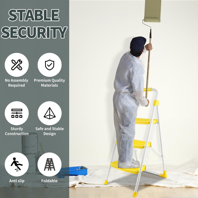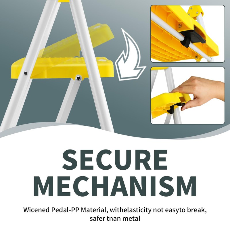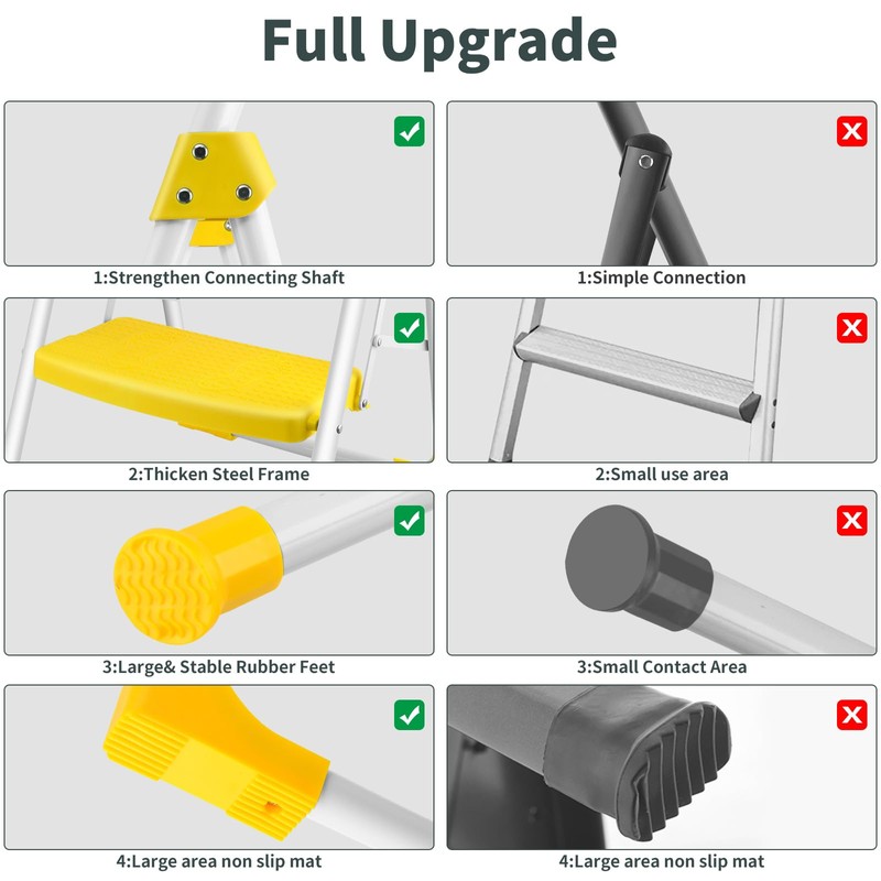 - Safety Material Stable Structure:The folding step stool is made of high-strength steel,Triangle stable structure is solid and durable.The multi-functional ladder is equipped with a safety lock switch.The back cross brace structure strengthens the basic support,the sponge safety handrail,enhances the safety and stability