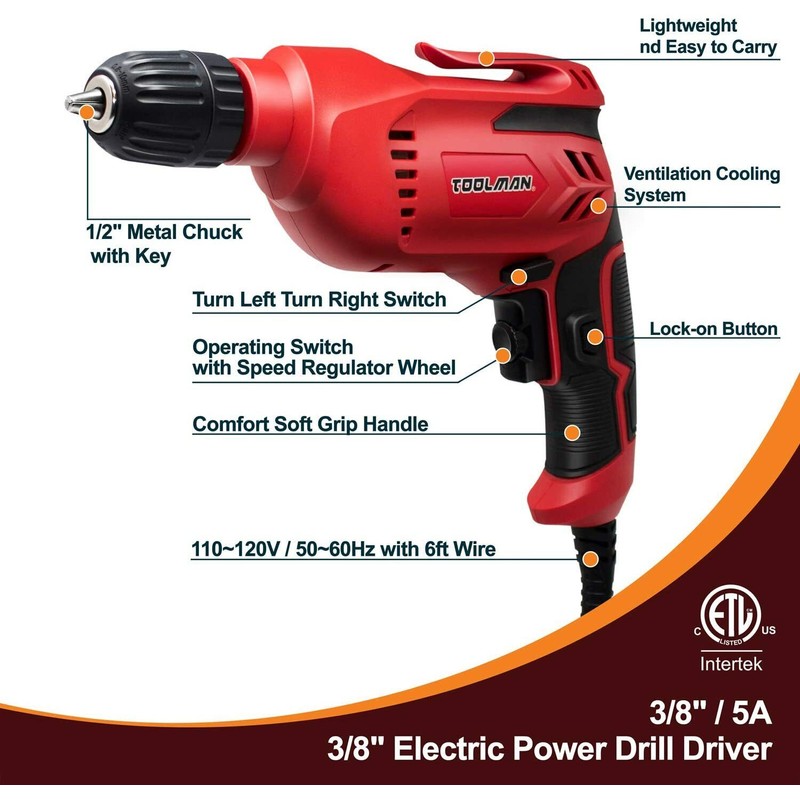 TOOLMAN 3/8 inch Corded Electric Drill Variable Speed Reversible Power Drill