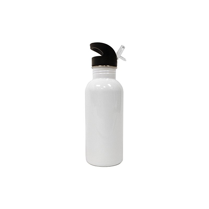- 600ml white coated aluminum water bottle with screw-on cap, carabeener, and suckle cap with attached cover. Print on one side. May also be the style pictured in the secondary image (no-spill fold-out straw spout)