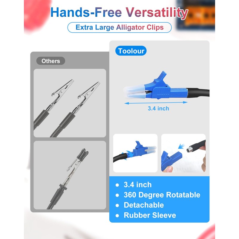 • 【Extra Large Alligator Clips - Hands-Release Versatility】Secure larger PCBs and materials with ease using our upgraded helping hands soldering alligator clips. These clips rotate 360°, offering multi-angle flexibility. The rubber sleeves protect delicate surfaces, ensuring no scratches or damage. Hands-release soldering has never been this easy! Work smarter, not harder