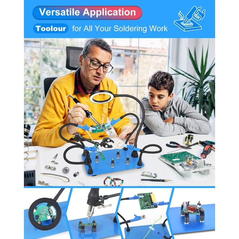 - 【Strong Magnets - User Friendly Design】The adjustable gooseneck arms of soldering helping hands, equipped with strong magnetic bases, allow you to reposition them anywhere on the base for ultimate flexibility. These arms stay securely in place without springing back, giving you the exact angle and support you need for any project