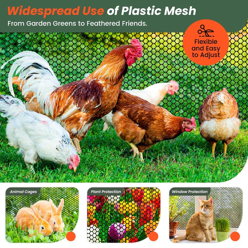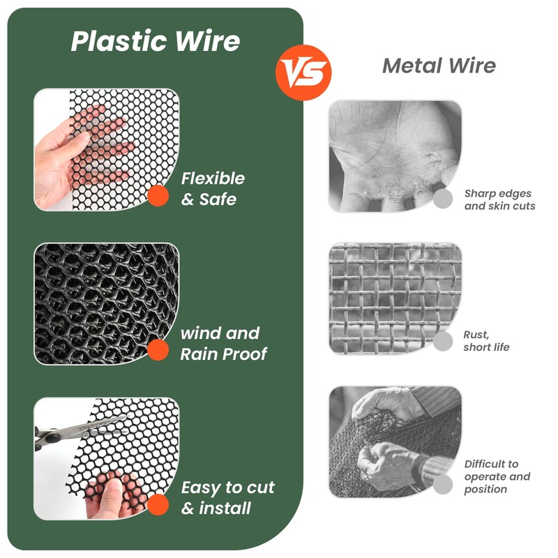 - Durable PE Plastic: Made from high-strength PE plastic, this plastic netting mesh is solid and weather-resistant. Unlike plastic-coated wire, it's a solid metal-free mesh that can withstand harsh weather. Good for flexible applications.