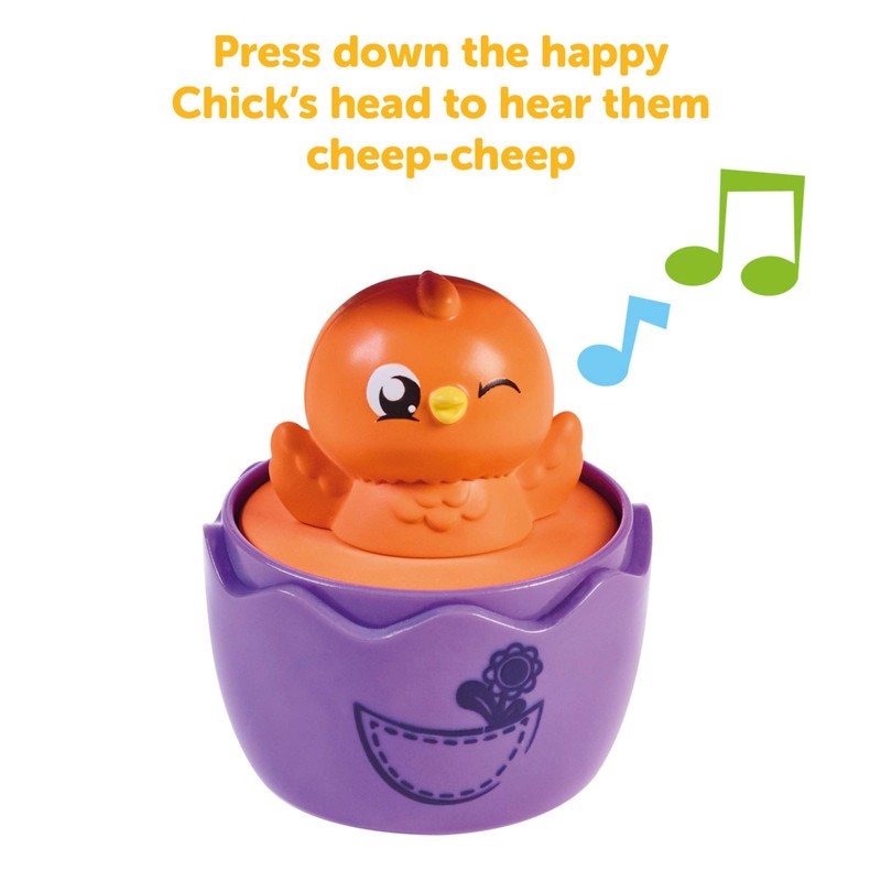 - PRESS AND LISTEN: An all-round sensory toy this toddler playset will alert your baby's attention as the colourful chick makes a cheerful chirping sound when pressed. Load the chick into the vehicle and set off on a farmyard adventure!
