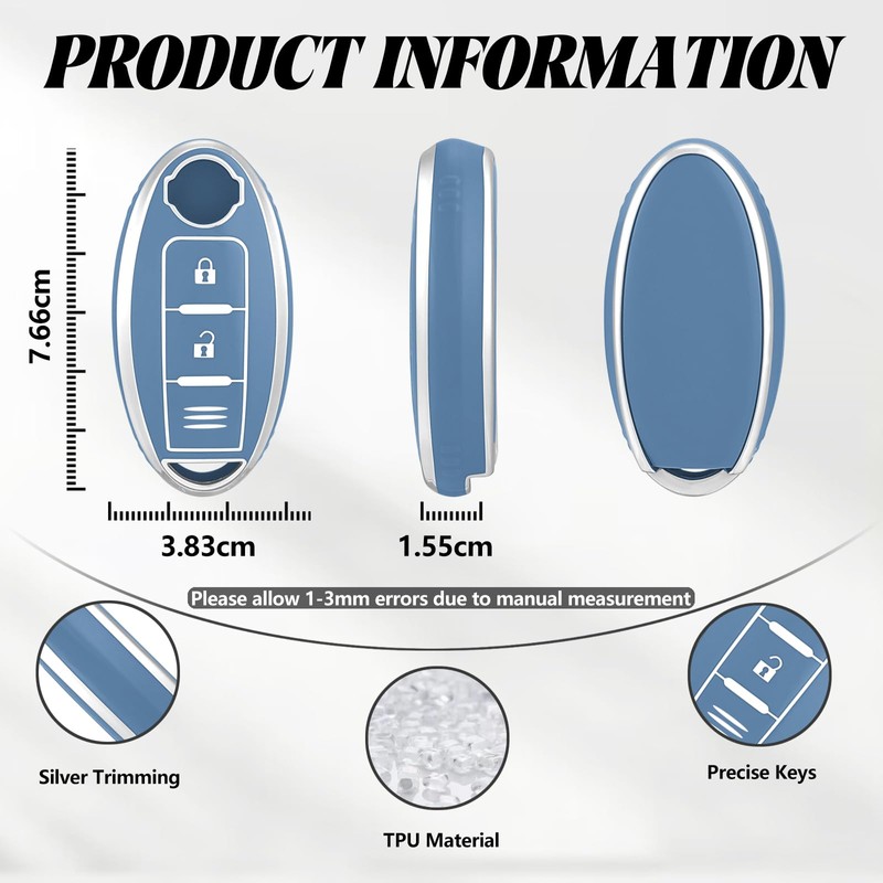 - 【Compatibility】The car key cover is compatible with Nissan Qashqai J10/J11/J12/J19 Juke F15 Xtrail T30/T31/T32/T33 Micra K13/K14 Murano Z51/Z52 Pulsar C13 Note E12 March K13 Leaf Navara Evalia Airya Tiida Kicks Cube Townstar Primastar Pathfinder Wingroad Armada Quest Rogue Versa Teana Maxima Altima Tritte Titan Sentra Sylphy Livida Latio Patrol Geniss Sedan Fuga Livina Terra Bluebird 350Z 370Z NV200 NV200M GT-R Infiniti Q30 Q50 Q60 Q70 Q70L QX50 QX60 QX70 QX80 EX35 EX37 FX35 FX37 FX45 FX50 G25.