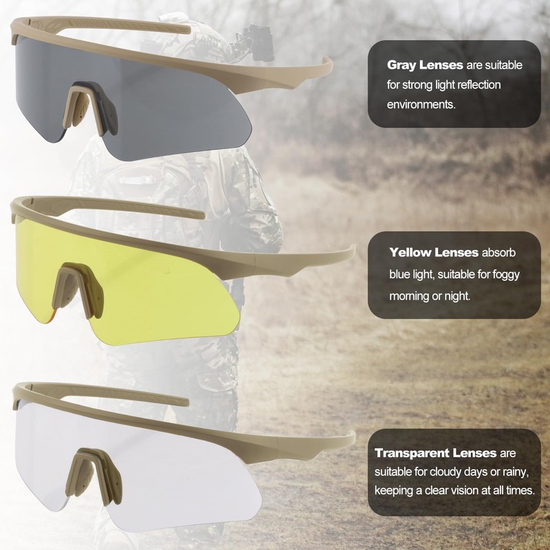 - 3 Color Interchangeable Lenses: With 3 impact-resistant polycarbonate lenses. Gray lens is for strong light environments. Yellow lens absorbs blue light, for foggy mornings or nights. Clear lens is for cloudy or rainy, keeping a clear vision at all times