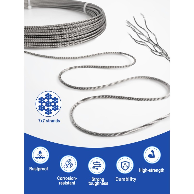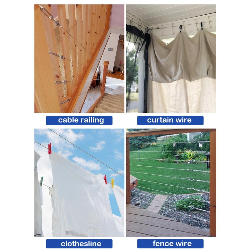 - 【High-quality materials】-- All tools in this kit are made of high-quality 304 stainless steel materials(except for the Aluminum Crimping Loop), which have high strength and durability and can be used in harsh environments. The cable has a 7x7 core structure, braided from 7 groups of 7 strands, which is flexible, strong and tough to use indoors and outdoors. In addition, all tools in this kit, such as the turnbuckle hook and eye, vine eyes, aluminum crimping loop and other tools have also undergone strict testing, ensuring high reliability.