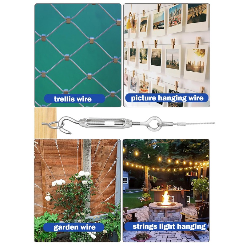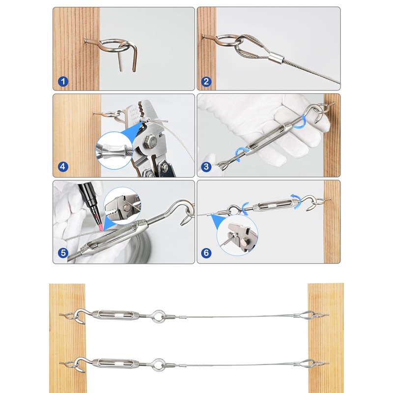 - 【Easy To Install And Remove】- The Ferrule Crimping Tool with Turnbuckle Wire Tensioner Kit is easy to install and remove. M4 turnbuckles adjustable wire rope tensioner has the advantage of adjusting length 100 mm-135 mm(4 inch-5.3 inches), It can be easily tightened up wire rope and adjusted to the length you want. Thimbles protect the cable wire and prevent wear, eye hooks for wood posts or brick walls. Perfect for string light hanging, wire trellis, fence wire, and picture hanging wire.