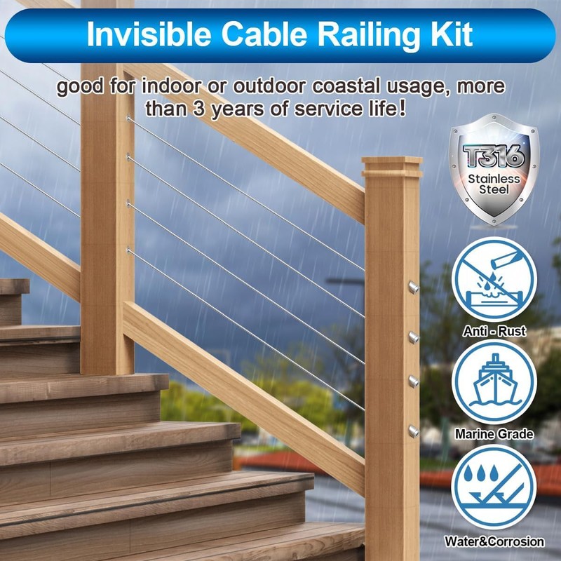 - Upgrade Your Cable Railing System: Our Invisible Cable Railing Kit is fabricated from high-strength marine-grade T316 stainless steel material, which is anti-rust, waterproof, and highly corrosion-resistant. It is ideal for both indoor and outdoor installations and is perfectly suitable for DIY stairs, porch, terrace railing, and deck railings