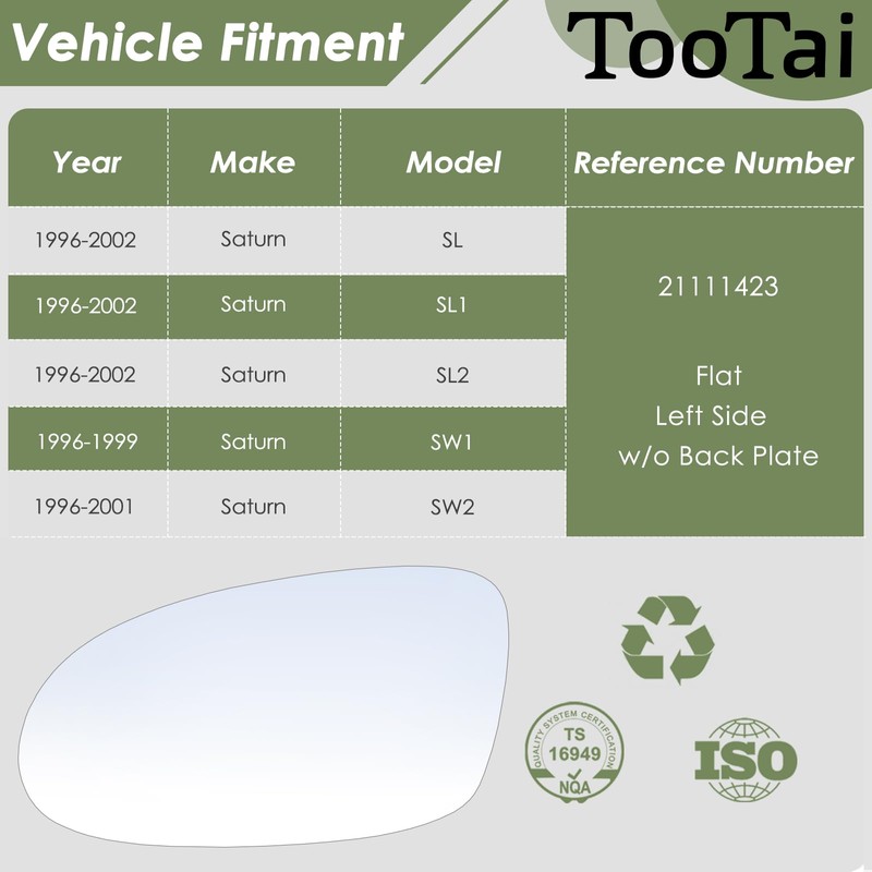 Tootai Driver Side Replacement Mirror Glass - compatible with Saturn vehicles - SL SL1 SL2 1996-2002, SW1 1996-1999, SW2 1996-2001 - non-heated, without backing plate
