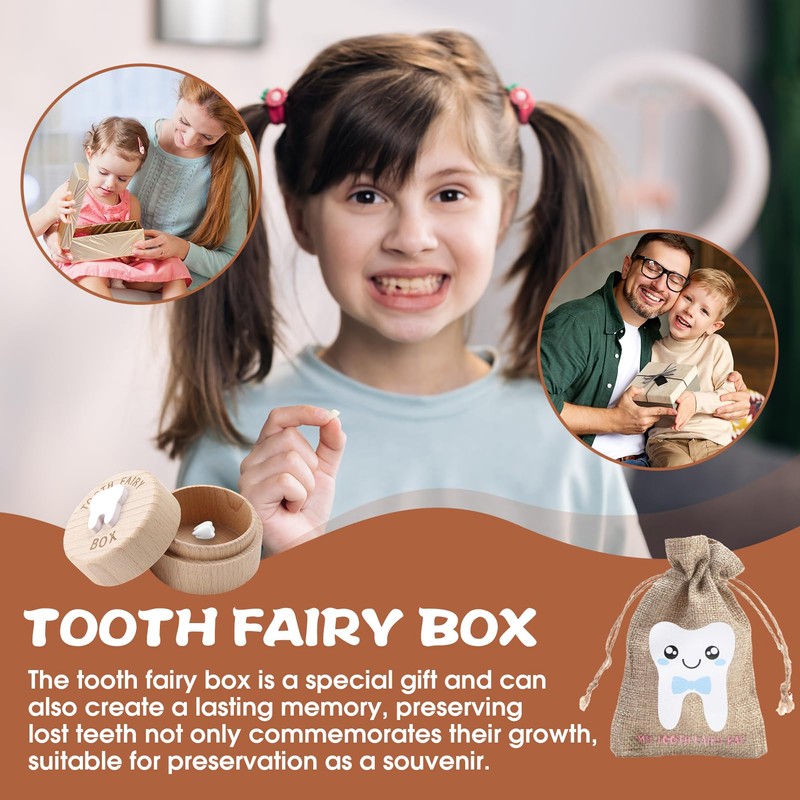 - Package Included: Together with a delightful tooth memorial box, you will receive a beautifully designed tooth fairy bag. Fallen teeth can be placed in a box by parents who want to keep a record of their child's development.A tooth fairy kit is a lovely little object that would make a wonderful memento.