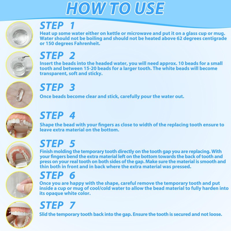 - 【Realistic Appearance】Our temporary tooth filler has a realistic appearance that is very close to the original teeth. Before starting to follow the instructions to make temporary teeth, please compare the bead color with your teeth. If the beads are whiter than the teeth, we recommend using regular heated tea instead of water for staining. The longer the bead stays on hot tea, the darker the color will be