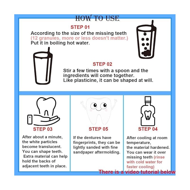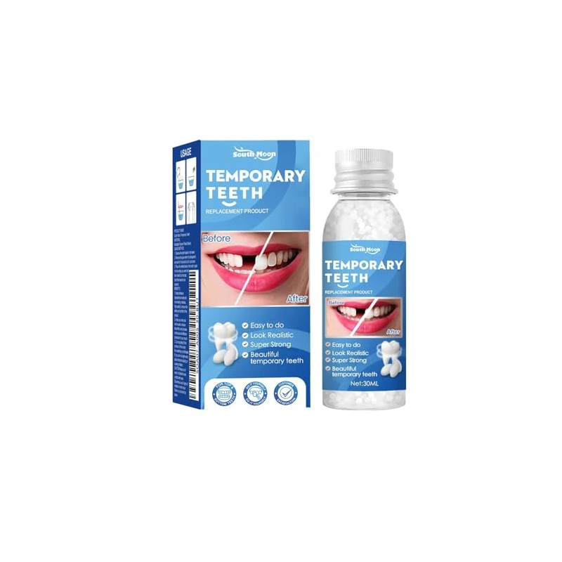 Use this kit as a temporary solution to improve smile. How to use: simply warm the beads in hot water. Then, carve the material into the area of the missing tooth. Let it dry. Once it's ready, you can secure the temporary teeth in place.