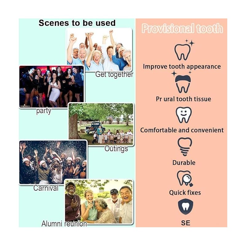 - 【Please Note】 :Temporary teeth are used to replace a missing tooth or crown but are not intended to replace a broken or chipped tooth. It is recommended that you need to follow the instructions for best results. Some clients may have difficulty getting their teeth done as our product does require some craftsmanship skills. Once you get the hang of it you will find it convenient and you will enjoy this method of dental restoration.