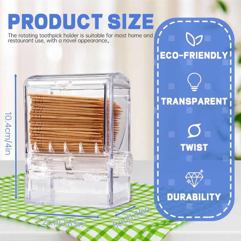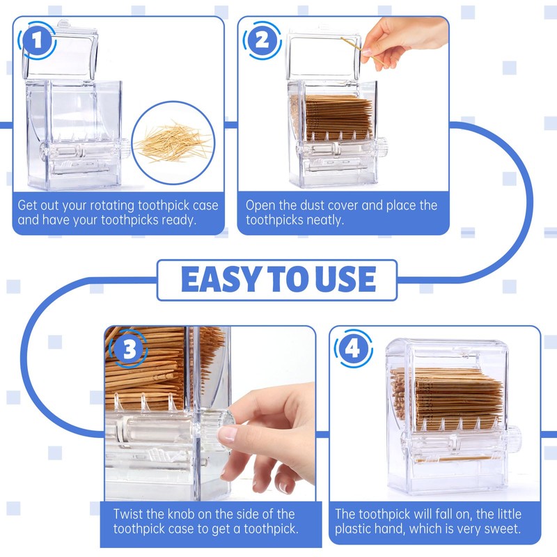 - 【Quality Material】This toothpick holder is made of high quality PC material, the size of the toothpick dispenser is about 4.1 x 2.9 x 2.2 inches, each tooth picks holder dispenser can hold about 500 toothpicks, filled once, can meet the needs of a long time or a large number of people, to avoid the trouble of frequent toothpicks.