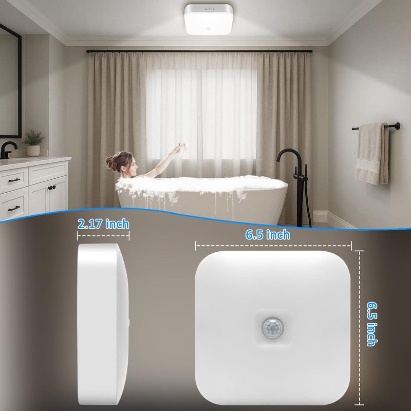 - Rechargeable Motion Sensor Ceiling Light - Compared to most battery operated closet light, our wireless rechargeable light for closet has a built-in 10000mAh large battery capacity, which means you can get longer lighting time with one full charge. After fully charged (Green light) in 12 hours, this motion sensor light indoor can last up to about 60-90 days. Size 6.5 inch x 2.2 inches.