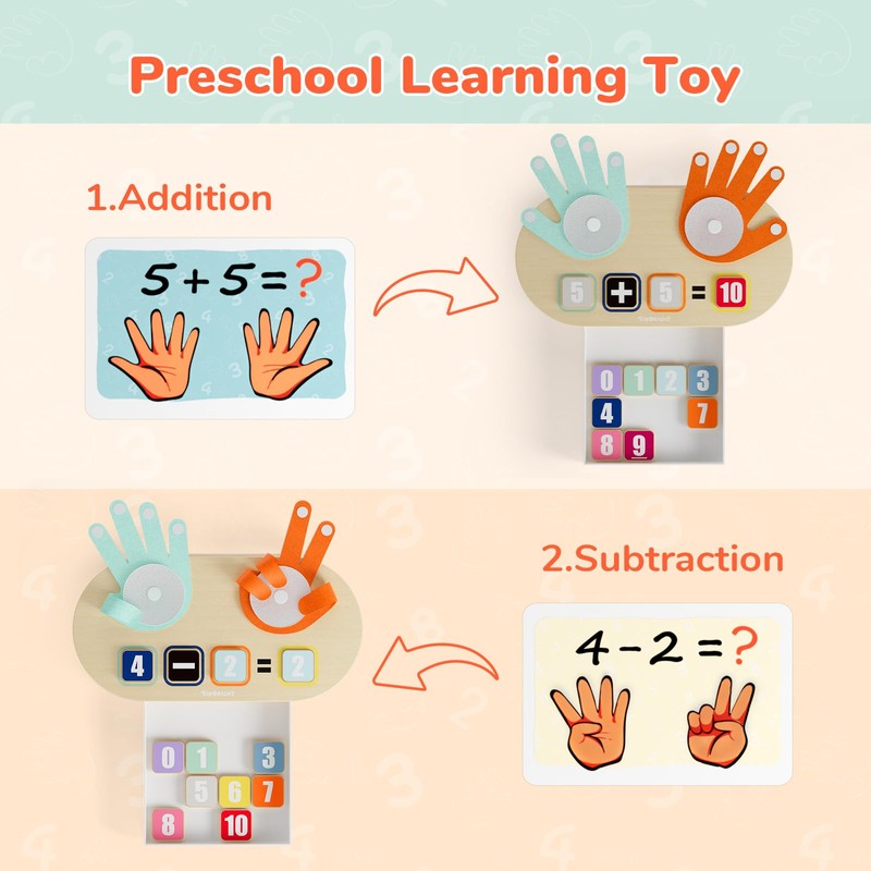 - Addition & Subtraction Math Board: Finger Arithmetic Game is a math manipulatives toy that helps toddlers and kindergarteners learn counting, addition, subtraction, and place value. The toy includes 12 wooden number blocks, 2 felt-material palms, 10 flash cards and a storage box. With 10 simulated fingers, its a fun and tactile way for kids to learn numbers and develop fine motor skills. Perfect preschool learning toy for boys and girls 3 4 5 year old