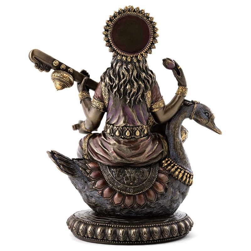 Top Collection Saraswati Sitting on Swan Playing the Vina Statue - Hindu Goddess of Music and Knowledge Sculpture in Premium Cold Cast Bronze - 8.5-Inch Collectible Hindu Figurine