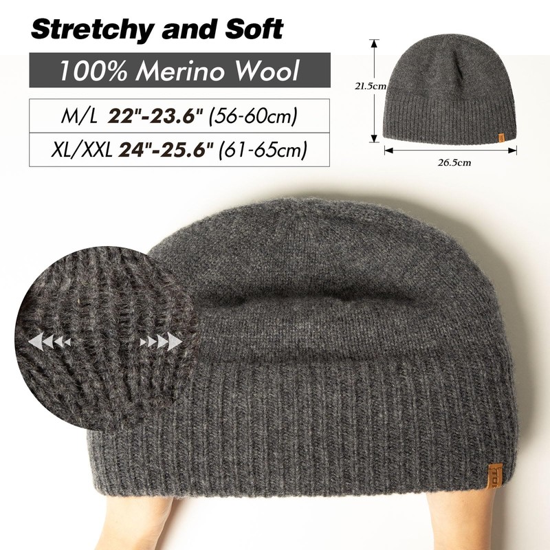 TOP-EX Large Winter 100% Merino Wool Trawler Fisherman Beanie Hat Men Women for Big Heads Warm Fleece Lined Thermal Wooly Hats for Running Golf Cold Weather Grey XL XXL