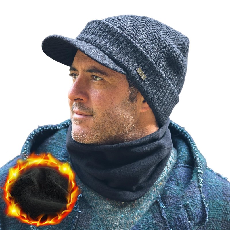 TOP-EX Winter 2 Piece Wool Knit Hat & Scarf Set for Men Visor Beanie Ear Flap...