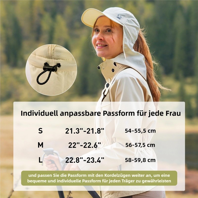 - Adjustable elastic drawstring with multiple size options: Equipped with an adjustable elastic drawstring, the cap ensures a secure and comfortable fit and is available in three sizes: S (54-55.5 cm, 21.3-21.9 inches); M (56-57.5 cm, 22-22.6 inches); L (58-59.5 cm, 22.8-22.6 inches). 3.4"). Perfect for various outdoor activities such as sports, hiking and camping.