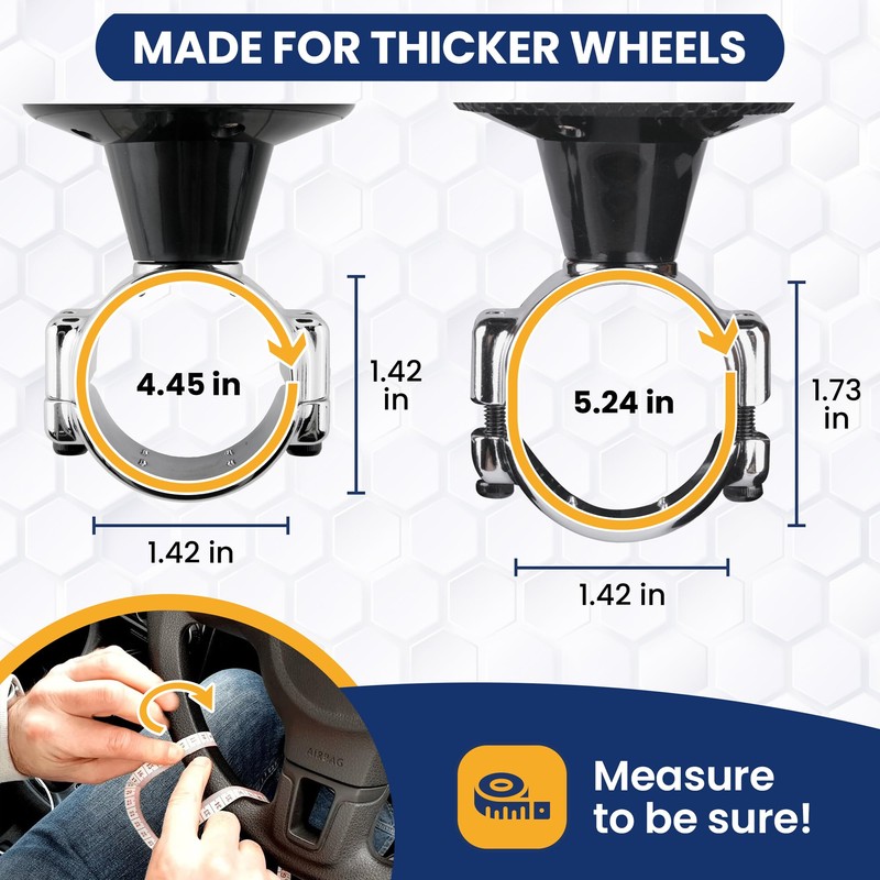 - FITS ALL STEERING WHEELS WITHIN THE DIMENSIONS of the extendable screw attachment (4.45" - 5.24"). Measure your wheel to be sure! The clamp is 1.42" wide (compared to 1.10" for our standard model). Protective rubbers are included to accommodate larger wheel diameters.
