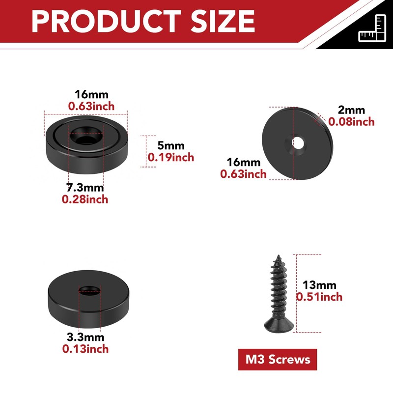 - 【EXQUISITE DESIGN】 Neodymium strong magnet size measure 0.63x0.19inch(16x5mm),tolerances: ±0.2mm x ±0.2mm. Heavy duty magnets strong outdoor contain 25 black round magnets with holes, 25 black iron sheets,and 50 black screws that can be used on non-ferrous contact surfaces with screws to install.