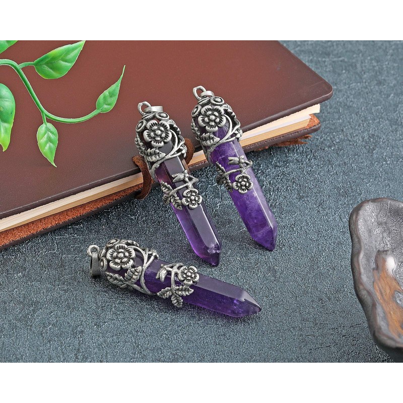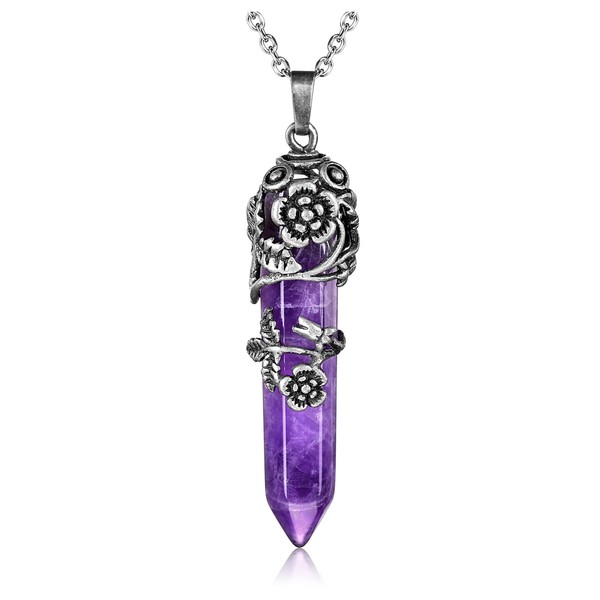 Top Plaza Antique Silver Flower Wrapped Natural Amethyst Healing Crystal Necklace