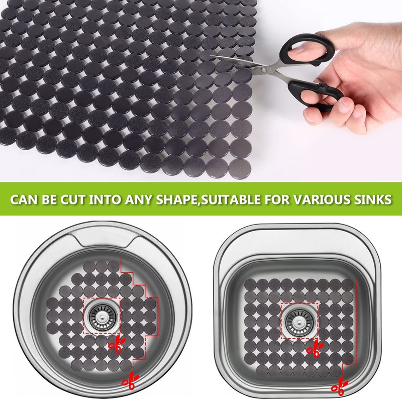 - 【Can Be Customized to Your Kitchen Sink】- The size of sink mat is 11.8x15.7. It can be cut to fit any area you need according to the bottom of the drain stopper. The color perfectly match the decor of stainless steel sink and porcelain sink.