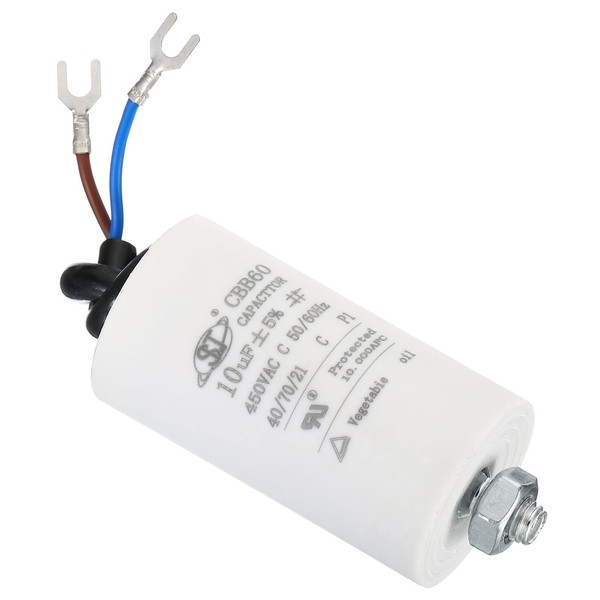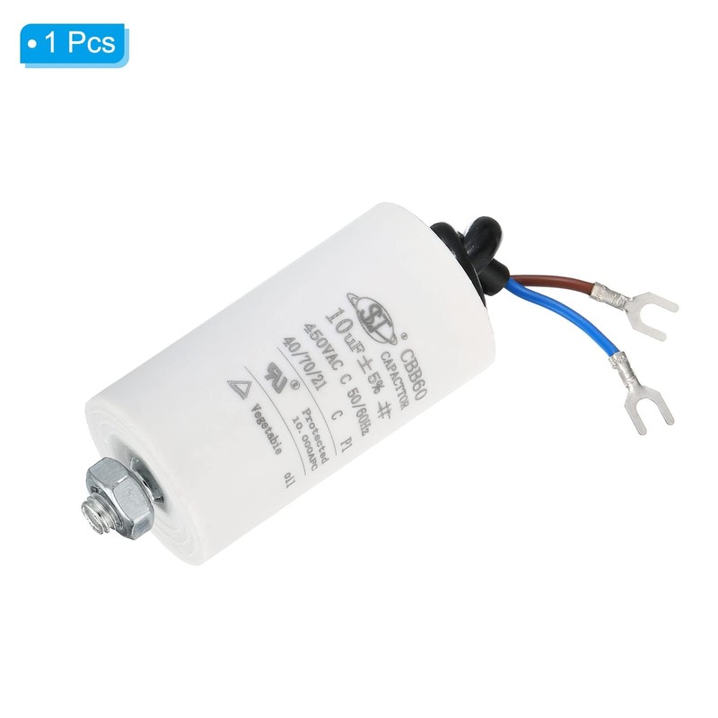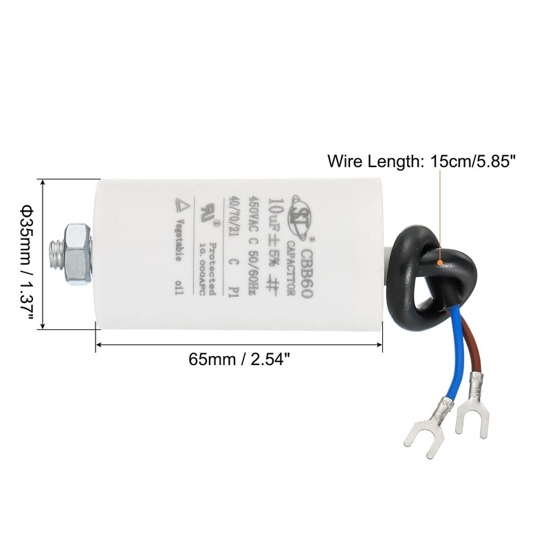 - 【Specification】Model: CBB60;Material: Polypropylene Film Plastic Shell;Lead End: 2 Wires;Tolerance: ±5%;Rated Capacity: 10uF ;Climatic Category: 40/70/21; Body Size: 65x35mm/3.04x1.37inch (L*D); ; Wire Length: 15cm/5.85inch ; Pack of 1Pcs Run Capacitor