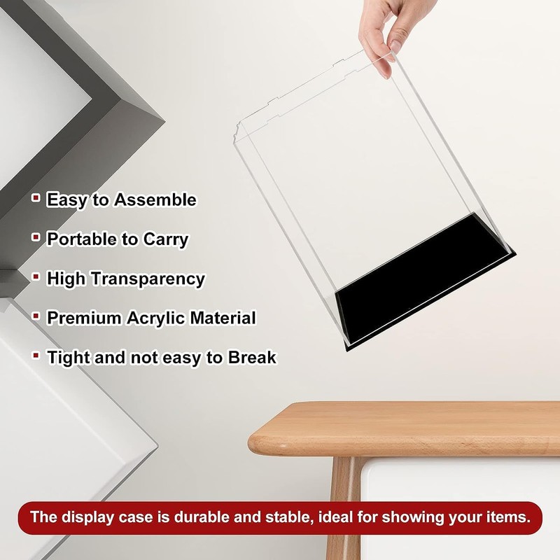 - Material: The display case is made of acrylic, with a black base, robust and durable, high transparency display. It is good for adding a stylish look to your collection and protect it from dust and odours.