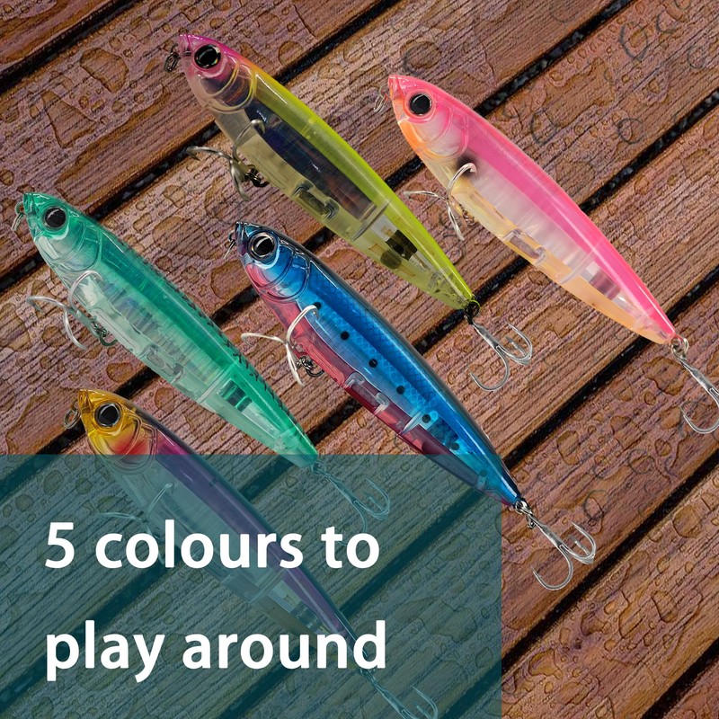 - TARGET FISH: Our topwater lures Kit comes in 5 different colours for different types of fish including trout, bass, salmon, dorado, perch, pike and more. Whether you are sea fishing, sea isle fishing, beach fishing, or lake, river, pond and stream fishing, this lure set is perfectly adapted to both freshwater and saltwater environments to meet your diverse fishing needs!