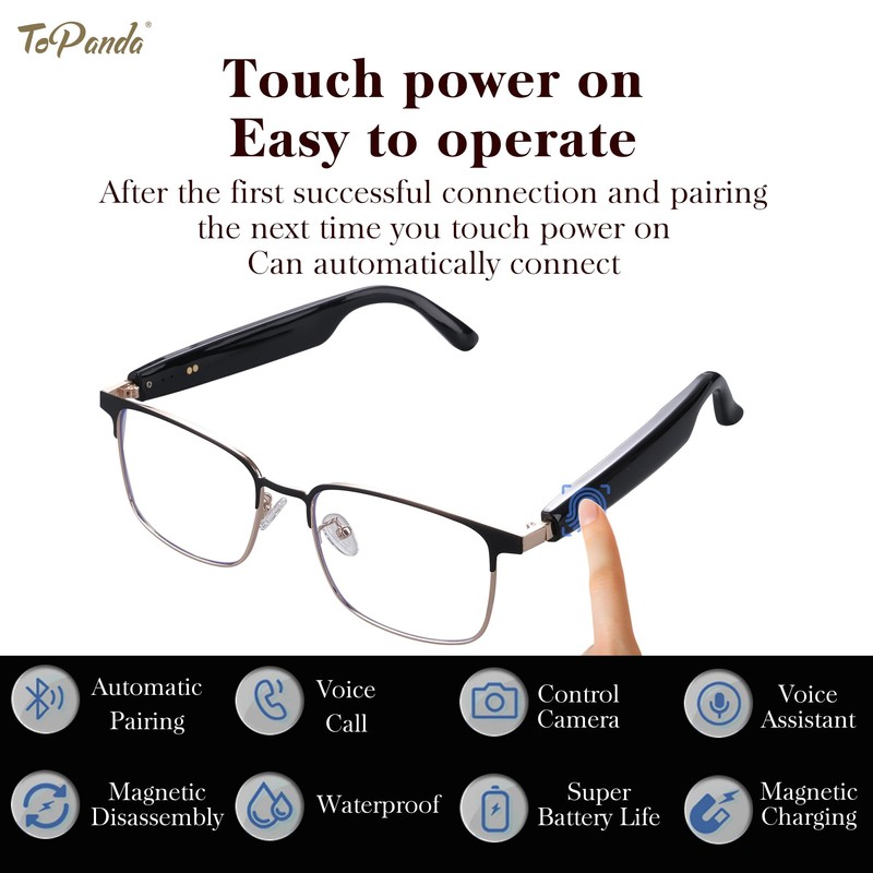 - Invisible Slide Touch: The hidden touch sensor in the temples allow you to operate the unit comfortably. General interactive controls like adjusting volume, soundtracks play/pause/switch, answering, or turning down calls are all at your fingertips.