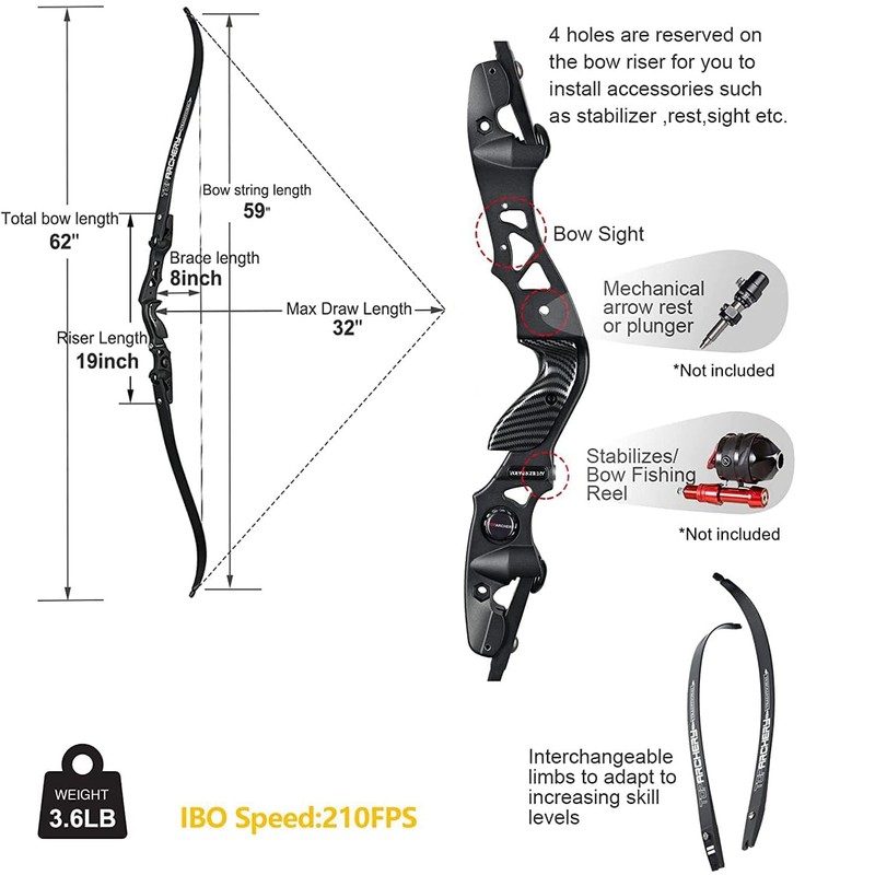 - The bow piece adopts ILF international common interface. The size of the bow handle is 19'', and it is 62" with the bow piece.